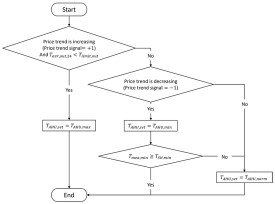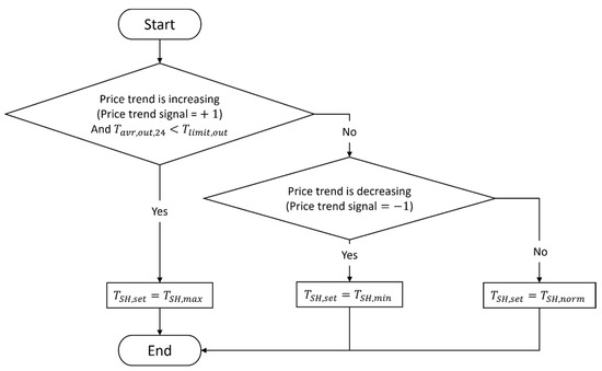 This electricity-based single price DR control algorithm considers only the hourly electricity price trend. The electricity price trend signal () was used for DR control. The was calculated by Equation (3). The temperature setpoints for space heating were assigned based on the procedure shown in Figure 5.