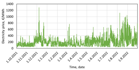 The cost of electricity comprises the cost of electricity energy and electricity power. The cost of electricity energy was determined by the hourly electricity consumption and the hourly electricity price. The hourly electricity price was the sum of the marginal price, the real-time electricity price from Nord Pool [45], and hourly distribution fee. Figure 7 shows the hourly electricity price including all taxes in the simulation period. The cost of electricity power was determined by the monthly basic fee and the sum of power fees for monthly peak electricity powers. The distribution and power fees of electricity are listed in Table 5.