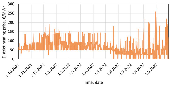 The cost of DH also consists of the cost of DH energy and DH power. The DH energy cost was determined by the hourly DH consumption and the hourly DH price. The hourly DH price was derived from the DH system in the study by Ju et al. [32]. The DH system consists of three combined heat and power (CHP) units, heat pumps employing the waste heat of sewage water, heat-only boilers, and a thermal energy storage (TES) unit. The heat production combination of each hour was generated from the EnergyPRO model of the DH system. The hourly DH price was determined by the marginal costs of DH productions. The pumping costs of the network and the network losses were also considered in the dynamic DH price. Additionally, to ensure the annual revenues of DH company are realistic by using the dynamic price, the marginal costs were scaled so that the weighted annual average DH price is equal to that of the DH company. More detailed information about the dynamic DH price can be found in [32]. Figure 8 shows the hourly DH price including all taxes in the simulation period. The DH power cost consists of the basic power fee and the peak power fee for the annual maximum used DH power. The details of distribution and power fees including all taxes are presented in Table 5.