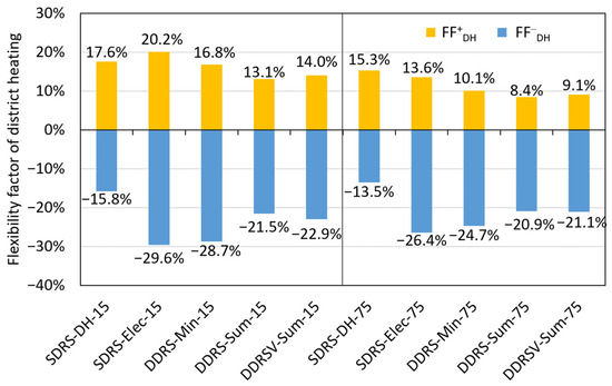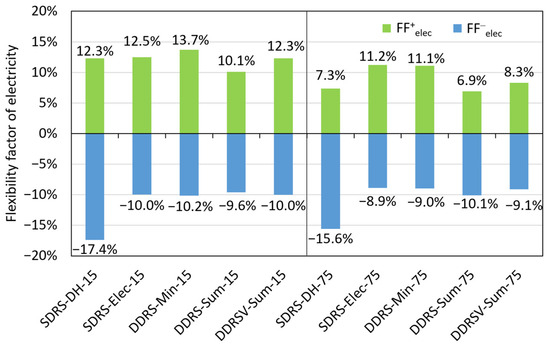 Figure 13 and Figure 14 show the flexibility factors of DH consumption and electricity consumption, respectively, which demonstrate the effects of different DR control algorithms on the overused/saved DH and overused/saved electricity. The electricity flexibility factors range from 6.9 to 13.7% for charging and from −8.9 to −17.4% for discharging. The DH flexibility factors vary between 8.4 and 20.2% for charging and between −13.5 and −29.6% for discharging. It can be seen that the single-price DR and dual-price DR both provide flexibility in DH and electricity consumption. However, a higher may not correspond to a larger and the same for and . For example, when a low marginal value is used, the maximum and maximum both occur in case SDRS-Elec-15, and the maximum and maximum fall in case DDRS-Min-15 and case SDRS-DH-15, respectively. Whereas, when a high marginal value is used, the maximum and maximum are achieved in case SDRS-DH-75 and case SDRS-Elec-75, respectively, and the maximum and maximum occur in an opposite way.