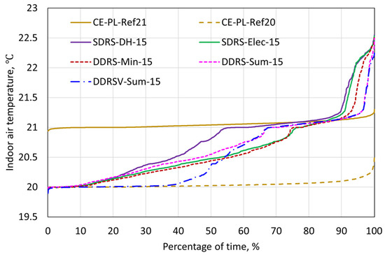 Duration curves of indoor air temperature of reference cases and DR cases (marginal value of 15 €/MWh) during the occupied time in the heating season (October–April).
