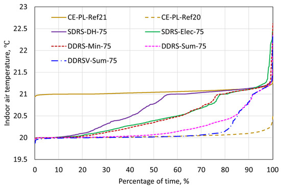 It is noteworthy that all the DR cases show fewer hours with indoor temperatures below 21 °C compared to the reference case CE-PL-Ref20. With a low marginal value, the percentage of hours below 21 °C ranges from 54% in case SDRS-DH-15 to 75.7% in case SDRS-Elec-15. With a high marginal value, it ranges from 55.4% in case SDRS-DH-75 to 91.4% in cases DDRS-Sum-75 and DDRSV-Sum-75. However, applying DR to space heating and AHU heating have different effects on the duration of indoor air temperatures falling below 20 °C. Compared to the reference case CE-PL-Ref20, applying DR only to space heating reduces the duration of indoor air temperatures falling below 20 °C. In cases where DR is applied to space heating, the number of hours with indoor air temperatures below 20 °C is limited to 2 h (0.1% in Case DDRS-Sum-75). In contrast, applying DR to both space and ventilation heating increases these hours, with indoor air temperatures falling below 20 °C for up to 78 h (4.1% in Case DDRSV-Sum-75).