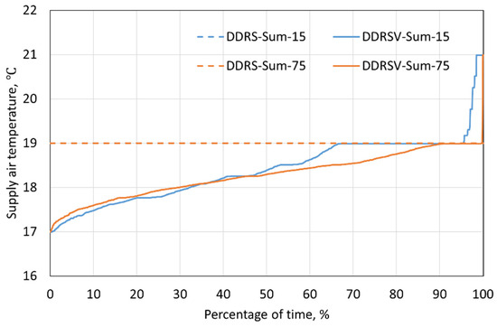Figure 15 and Figure 16 visualize the duration of indoor air temperature of the coldest zone (Zone 1 shown in Figure 1) for low and high marginal values, respectively. Among the DR control algorithms, the DH-based DR control (SDRS-DH-15 and SDRS-DH-75) consistently results in the fewest hours with indoor temperatures below 21 °C, regardless of whether low or high marginal values are applied. In addition, it is evident that applying DR only to space heating results in more comfortable indoor conditions compared to applying DR to both space and ventilation heating. With a low marginal value, it can be observed that for more than 65% of the occupied time, the indoor air temperature is lower when DR is applied to both space heating and ventilation heating (DDRSV-Sum-15) compared to when it is applied only to space heating (DDRS-Sum-15). With a high marginal value, this extends to over 85% of the occupied time. This finding could be explained by the observation that the supply air temperature is below the normal setpoint of 19 °C for most of the occupied time as shown in Figure 17.