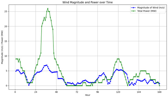 Also, information on the total production power of wind power plants is available hourly for the entire region. To enhance the clarity of the data presentation, Figure 1 illustrates the magnitude of wind speeds recorded at measurement point 8, along with the total power production for the entire zone over one week from 21 January to 27 January 2022 (168 h).