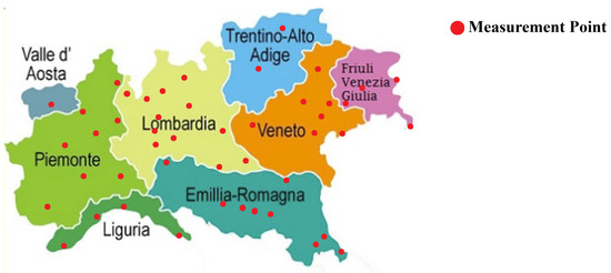 In this work, a new approach is proposed to select the “input points” (denoted as measurement points) by identifying the main cities (province capitals in Italy) of the region. Additionally, since the capital cities comprise a substantial number (47 in the northern region of Italy), an exhaustive comparison of several feature-selection techniques is performed to reduce the number of input features. Furthermore, many state-of-the-art machine-learning and deep-learning regression methods are compared.