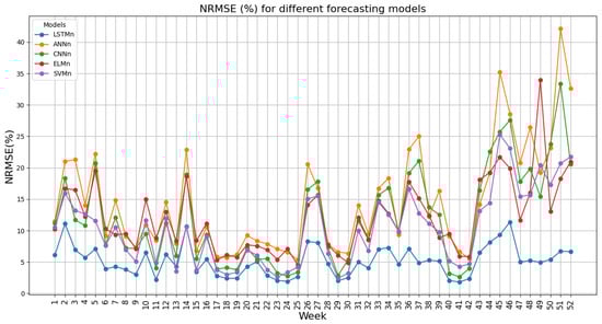 The prediction scenario is as follows: Initially, two months of data from 20 January 2022 to 20 March 2022 are used as training data, and the week after this period is used as test data. Subsequently, all the data are shifted forward by one week, and this process is repeated for 52 weeks. This approach ensures one year of forecasting, thereby enhancing the comprehensiveness of the method and results. The simulation results spanning 52 weeks are presented in Figure 3. The figure includes the NRMSE expressed as a percentage. Table 6 provides an overview of the overall NRMSE for all five methods.