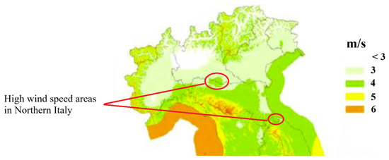 The results of all methods are presented in Table 11. Based on the results presented in this table, Spearman’s method demonstrates superior performance among the four evaluated methods. This approach not only selects the fewest number of features but also achieves the highest accuracy and the shortest prediction time for the study area. Consequently, Spearman’s method is highly efficient and effective in feature selection for this case study. The cities that have been selected as more effective cities with this method include Piacenza, Rimini, Cremona, and Mantova, whose locations are shown in Figure 8, which shows that the average wind speed (at 75 m) is high in the regions nearby those selected cities.