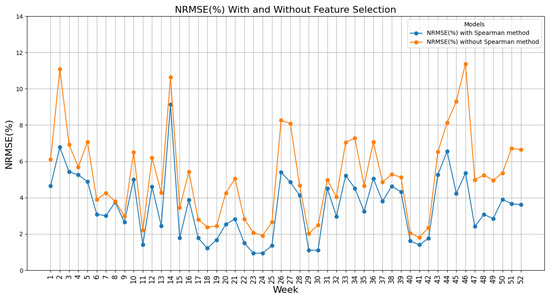 Comparison of NRMSE(%): with and without feature selection (Spearman method).