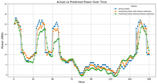 To demonstrate the effect of improving forecasting accuracy, the actual and forecasted data for a week from 21 March 2022 to 27 March 2022 (168 h) were compared in both cases: with and without feature selection. This comparison is illustrated in Figure 10.