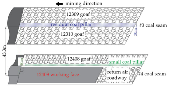 - The small coal pillar, which drives into the close-distance coal seam, is intended to be 8 m wide, and the overlaying residual coal pillar and the 12409 return air roadway are intended to be 20 m apart horizontally.