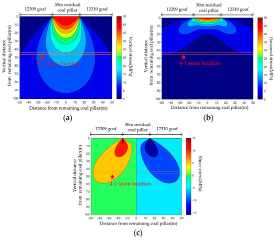 Underlying coal rock stress distribution nephogram. (a) Vertical stress curve. (b) Horizontal stress curve. (c) Shear stress curve.
