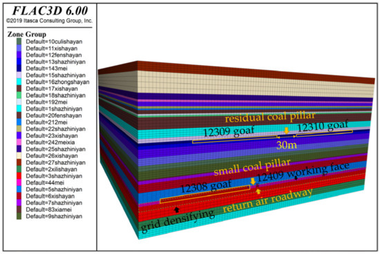 Figure 3 illustrates that the model’s size is: X(length) × Y(width) × Z(height) = 400 m × 320 m × 160 m. Both the 3-1 and 4-1 coal seams are encrypted. The model is divided into 1,041,000 units and 1,121,807 nodes. Mohr–Coulomb yield is the criterion that the model uses, and sets the working face to advance along the Y-axis direction. Except for the model’s top, the other five faces of the model are set as fixed boundaries, and zero displacement boundary conditions are used. There is a free boundary at the top of the model. According to the buried depth of the coal seam, the model’s top uses a 9.9 MPa load, and its lateral pressure coefficient is 0.8. Table 1 displays the mechanical and physical characteristics of coal layers.