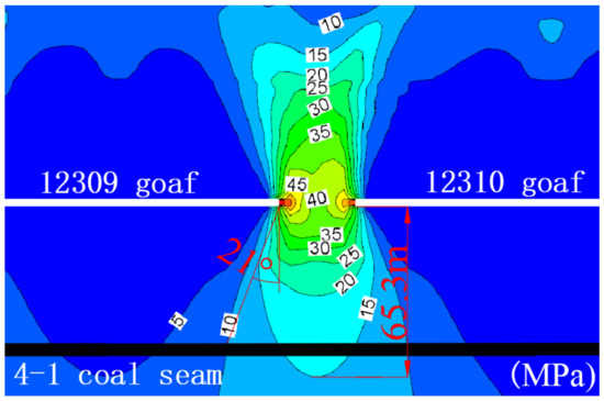 Utilizing numerical computation software, following the mining of the three coal working faces of the Selian No. 2 Mine, the stress action zone of the residual coal pillar on the underlying 4-1 coal seam is examined. After numerical calculation and graphic processing, the residual coal pillar’s stress distribution in the 3-1 goaf in the underlying coal seam is obtained (see Figure 4).