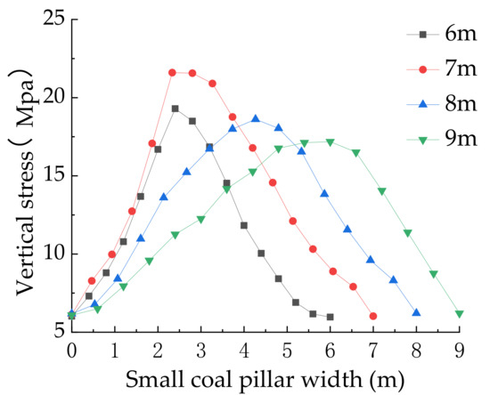 Figure 6 shows the small coal pillar’s vertical stress distribution curve demonstrates that the stress of small coal pillars with varying widths basically exhibits a trend of increasing first and then decreasing. When the width of the small coal pillar is 6 m, the internal maximum stress is 19.29 MPa. At this time, the coal pillar is seriously broken under the influence of the static pressure of the overlying strata and the dynamic pressure of the working face. The peak stress rises to 21.59 MPa when the small coal pillar’s width is 7 m as opposed to 6 m, and the plastic zone inside the 7 m small coal pillar accounts for a relatively small proportion, and large deformation may occur due to mining disturbance. Therefore, it is not appropriate to arrange 6 m and 7 m small coal pillars.