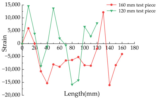 The strain curve of the 160 mm test piece (corresponding to the 8 m small coal pillar) is obviously distinct from that of the previous test pieces. The strain value is negative in the range of 20~120 mm in the middle of the strain curve, which indicates that the test piece is in a relatively stable compression state in this range. Except for a certain broken area in the range of 20~120 mm and 120~135 mm, the residual parts of the test piece are in a state of compression. The thorough investigation demonstrates that the 8 m small coal pillar has a certain bearing capacity.