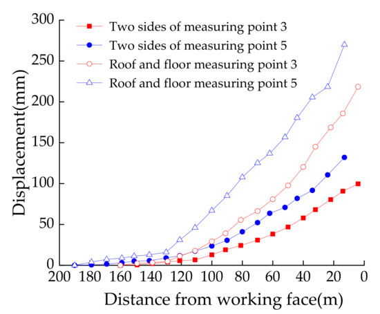 Figure 13 shows that the deformation law of the nearby rock at each measurement point is essentially the same. With the working face in operation, the cumulative displacement of the surrounding rock increases, and the total displacement of the roadway’s roof and floor is more than the total displacement of the roadside. The roof and floor of the roadway are more obvious than the mine pressure of the side. The sides’ rate of deformation progressively rises as they get 60 m away from the operating face, but the increase is less than that of the roof and floor.