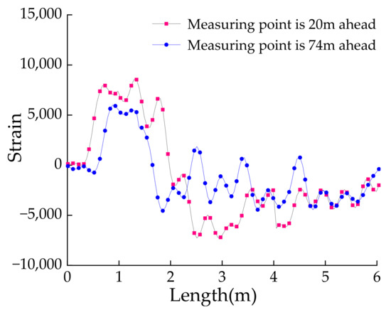 As the working face reaches 20 m in front of the measurement point, the strain of the optical fiber at 1.34 m changes from positive to negative, and the stress of the fiber at this position changes from tension to compression. It is considered that 1.34 m in the small coal pillar is the intersection of the elastic and plastic zones. The small coal pillar’s 1.34~5.9 m fiber strain is constantly under compression, indicating that the bearing area is produced within the pillar. The stress concentration of the surrounding rock mainly appears in the deep part of 1.34~5.9 m.