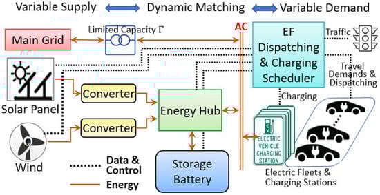 In order to transform this practical problem into a reinforcement learning simulation, this study will make the following assumptions. (1) We simply evaluate energy transformation and do not account for energy losses caused during energy transformation. (2) The renewable energy inputs are wind and solar power, both of which are mathematically modeled for energy creation, as will be detailed in greater detail below. (3) This paper does not address battery recharging for EV fleets, hence optimizing the use of renewable energy. We consider that this system (Figure 1) consists of a set of N EVs as = . Each vehicle refers to the vehicle ID.