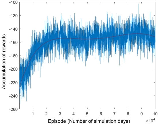 Figure 8 shows the results of the PPO algorithm’s training. As explained in the previous design, this research uses the PPO algorithm to train the agent to predict the weather for the next time interval. As illustrated in the figure, the accumulated reward acquired from the RL method based on the PPO algorithm tends to stabilize with more episodes as the built-in prediction accuracy increases and converges on the optimal solution. The figure represents the oscillation of the learning curve, which is caused by the stochastic policy function’s exploration of the state and decision space. All learning curves converge after around 20,000 training episodes, demonstrating that the cumulative reward score climbs steadily over the rounds and stabilizes later in the training process, with all learning curves converging beyond this point.