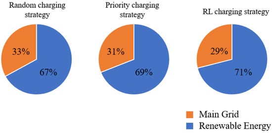 Figure 9 shows the proportion of electricity taken from the mains grid for the three charging strategies, 33%, 31%, and 29% for the random charging approach, the priority charging strategy, and the reinforcement learning charging strategy, respectively. Observably, the random charging strategy has the lowest utilization of renewable energy. The random charging consumes a large percentage of the nighttime hours, and as shown in Figure 6 and Figure 7, the rest of the time period generates the least amount of renewable energy; thus, a significant amount of energy will be taken from the main grid. The time-priority charging approach utilizes 69% renewable energy. In conclusion, the reinforcement learning strategy suggested in this paper will boost utilization to 71%. It is important to highlight that this is not the limit of renewable energy usage. This inaccuracy is a result of the algorithm’s inability to anticipate the next weather conditions with perfect accuracy. It still includes the uncertainty of weather information.