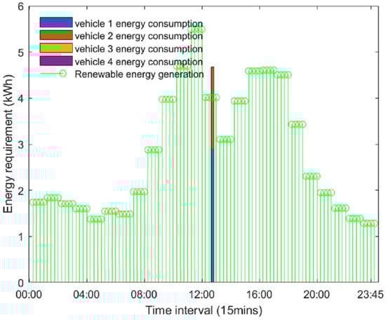 To study how reinforcement learning makes EV fleet charge decisions, we selected the data of the Leicester council depot on 28 March 2021 and the typical weather data for that date in the UK. As illustrated in Figure 10, two vehicles are to be charged on the selected day. At 12:30, vehicle 1 and vehicle 2 present their respective energy needs for the red and blue energy columns. The green pins illustrate the distribution of renewable energy generation according to the time of day. It is worth mentioning that this distribution is not shown to the agent. Therefore, the agent can only predict future energy output based on the meteorological circumstances, as previously presented.