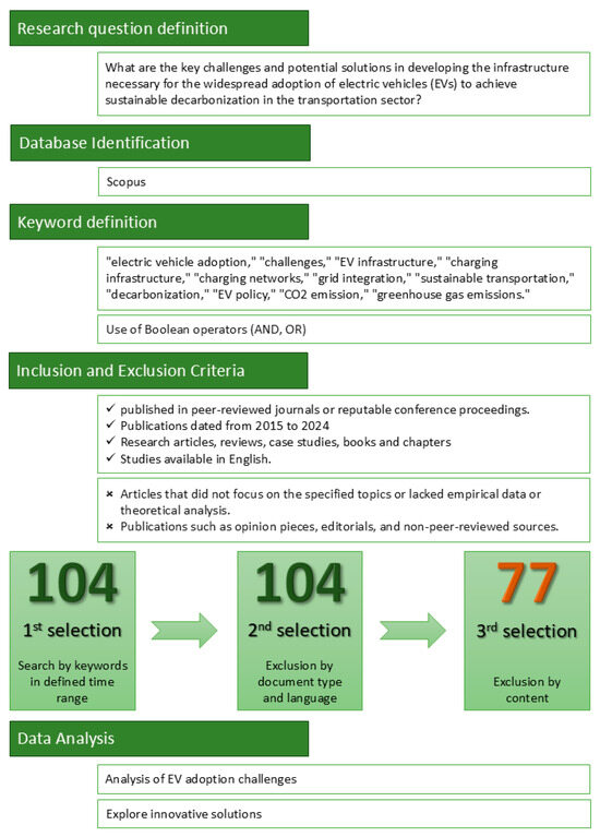 Next, the selected keywords were integrated into the search string as follows: TITLE-ABS-KEY (“EV adoption” AND challenges AND (infrastructure OR “charging networks” OR “grid integration”)) AND PUBYEAR > 2014 AND PUBYEAR < 2025. Here, TITLE-ABS-KEY specifies that the search should look for the search terms in the title, abstract, and keywords of the articles; Boolean operators ensure that the search includes articles mentioning EV adoption and related challenges, specifically focusing on infrastructure, charging networks, or grid integration, thereby covering a wide range of relevant topics; the last part of the string already applies the inclusion criterion of articles published after 2014 and until 2024. This time frame was chosen to ensure the inclusion of recent and consistent research following the 2015 Paris Agreement.