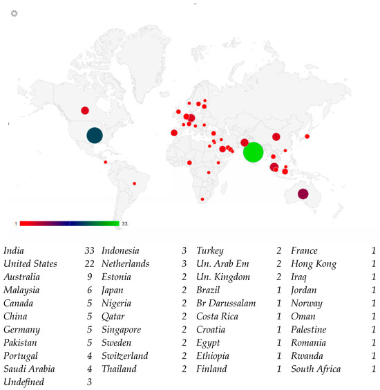 The geographical distribution of publications reveals a diverse global interest in EV adoption and infrastructure development. Figure 4 illustrates that India leads with 33 documents indicated with the largest circle on the map, followed by the United States with 22. Australia has contributed nine documents, while Malaysia has six. Canada, China, Germany, and Pakistan each have five publications. Portugal and Saudi Arabia have four documents each. Indonesia and the Netherlands have each contributed three documents. Several countries, including Estonia, Japan, Nigeria, Qatar, Singapore, Sweden, Switzerland, Thailand, Turkey, the United Arab Emirates, and the United Kingdom, have each contributed two documents. Other countries, such as Brazil, Brunei Darussalam, Costa Rica, Croatia, Egypt, Ethiopia, Finland, France, Hong Kong, Iraq, Jordan, Norway, Oman, Palestine, Romania, Rwanda, and South Africa, have each contributed one document. There are also three documents where the country of origin is undefined.