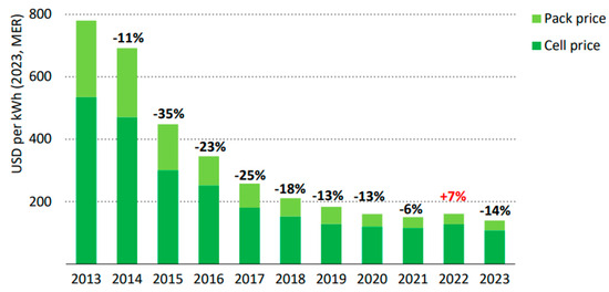 The development of EVs is heavily influenced by specific battery characteristics, which play a crucial role in determining their viability and market growth. Battery-related challenges present a multifaceted landscape. The most significant characteristics include energy density, charging speed, lifespan, safety, and cost [65,66]. Sachan et al. and Kore and Koul pose the challenge of EV battery prices and reliability that could be solved through local manufacturing in India, but essential materials for battery production are not available in the country [67,68]. In addition, there is a lack of a coordinated network of stakeholders, which further complicates efforts to address this identified issue. Also, associated investment-related risk delays the battery manufacturing development process in the country. On a global landscape, according to Galati and colleagues [69], the high price of the battery, representing 75% of the vehicle cost, is a factor in the disruption of EV adoption. However, recent trends in this industry demonstrated a considerable fall in the prices of lithium-ion batteries, 90% of which are used in transport electrification, due to R&D and technological advancement (Figure 6) [70]. Although prices rose slightly in 2022 (+7%), this increase was not substantial compared to the overall downward trend over previous time spans.