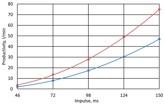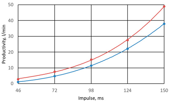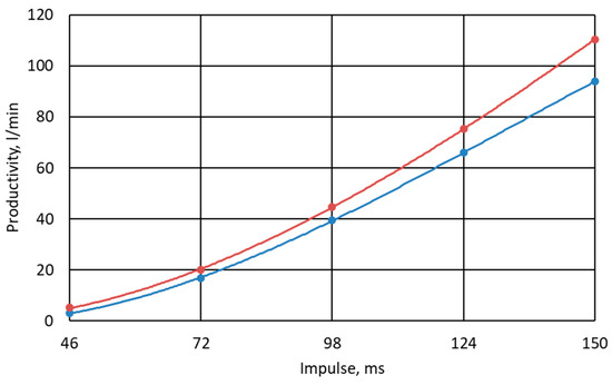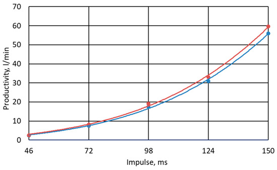 Based on the obtained results, the dependences of the conditional productivity of the injectors (L/min) on the impulse/opening times (ms) are constructed (Figure 1, Figure 2, Figure 3, Figure 4 and Figure 5).