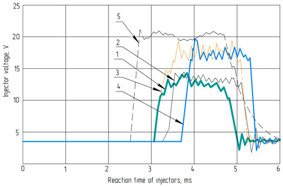 The results of research on the response time of gas injectors. 1—Keihin; 2—Valtek; 3—Barracuda; 4—Hana; 5—Matrix.