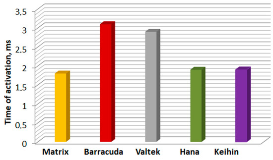 From the analysis of the results obtained in Figure 6, the Hana injectors had the lowest response time (1.75 ms), followed by Keihin (1.99 ms). The Valtek injectors showed good response rates (2.07 ms), as did Barracuda (2.19 ms), and the highest response time was found for the Matrix injectors (2.44 ms).