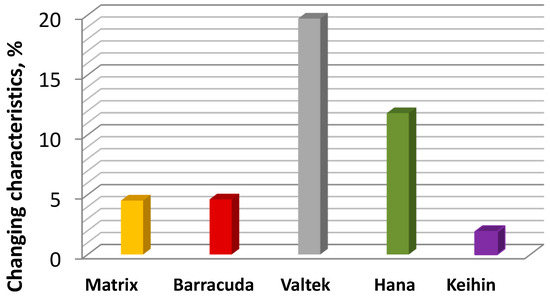 Analyzing the graphical dependences of Figure 1, Figure 2, Figure 3, Figure 4 and Figure 5, according to the indicators of productivity and linearity in the process of using biogas, it was established that the parameter deviations for Matrix injectors are 32.9%; Barracuda—7.5%; Valtek—38.8%; Hana—19.1; and Keihin—15.3%. As you can see, according to this indicator, the experimental injectors have different values. Valtek injectors (Figure 3) have the highest deviation in productivity and linearity of work, with an average of 38.8%, and the lowest deviation in Barracuda injectors is 7.5%. Keihin (15.3%) and Hana (19.1%) injectors also showed good performance indicators, and therefore can be effectively used for biogas fuel systems.