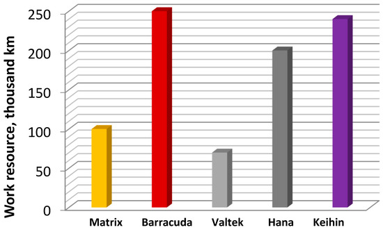 The resources of the injectors (Figure 9), which were investigated according to the data of the “PROFIGAS” service station in Ivano-Frankivsk (Ukraine), were the largest for the Keihin, Barracuda, and Hana injectors (from 200 to 250 thousand km of vehicle mileage), and the lowest for the Valtek and Matrix injectors (whose mileage varied from 70 to 100 thousand km).