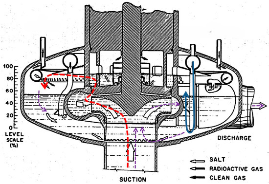 - the inclusion of a gas injection and removal device and a fuel additive device in a molten salt pump (or a by-pass loop) to facilitate the removal of xenon poison and the additions of reactivity.