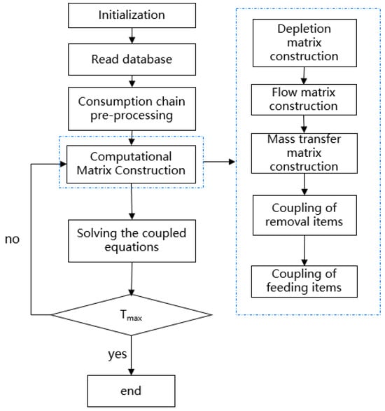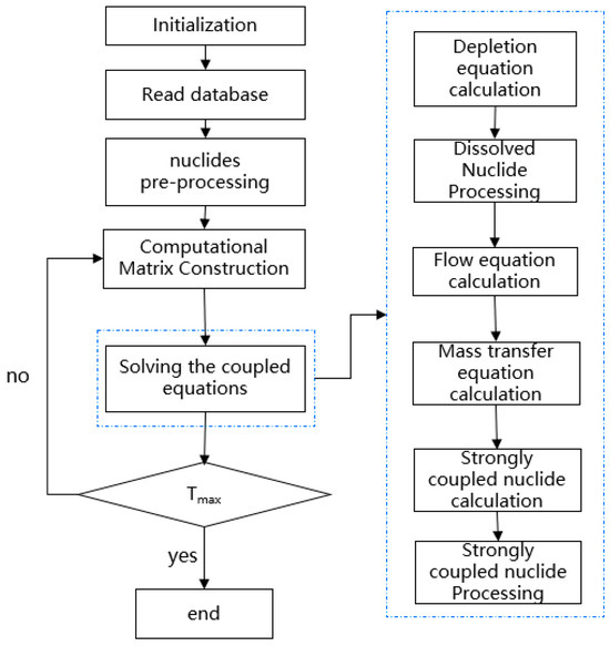 For transient calculations of burnup-flow coupling, it is sufficient to split them directly and then calculate them separately. However, for the evolution of neutron poisons such as xenon and samarium, the mass transfer effect cannot be ignored. Therefore, in the calculation flow of the splitting method, the coupling strength of nuclides in the transport process is first evaluated. Then, for weakly coupled nuclides, the accuracy of the splitting method solution results is enough. For strongly coupled nuclides, special treatment is needed. Firstly, its decay-transmutation chain is traced back to carry out the calculation of the whole nodes with multiple nuclides, and then the value of the calculated value and the result of the weakly coupled calculation are replaced at the end of the calculation. The complete procedure is shown in Figure 3. In the solution method, the complex depletion equations are solved using the Partial Fraction Decomposition Chebyshev Rational Approximation Method (PFDCRAM) for solving the matrix exponentials, where the system of linear equations is solved using UMFPACK, and the other equations are solved using the matrix exponential-solving method with the Taylor expansion.