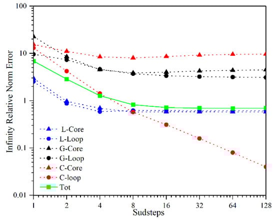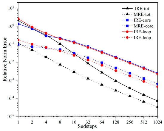 In Figure 6, the solid line is the IRE and the dashed line is the MRE. The triangle, rectangle, and circle icons are the total nuclide error, the core area error, and the loop part error, respectively. It can be seen that both the IRE and the MRE decrease with step encryption. When the step size is encrypted to about 1000 steps, the concentration error in the core region is the largest, the concentration error in the outer loop is the next largest, and the concentration error in the total amount is the smallest. At this point, the error of the total nuclide amount is at the 10−5 level, which is comparable to the accuracy of the advanced matrix exponential method [22]; the error of the constituent regions is at the 10−3 level, which is comparable to the error of the MODEC and ORIGEN-S [23].