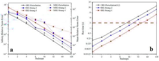 At the same time, we evaluated the accuracy and time cost of solving the problem using the symmetric Strang splitting and small perturbation methods; the results are shown in Figure 7. In Figure 7a, the black triangles represent the small perturbation method; the blue rectangles and the red circles are the symmetric Strang splitting method and the normal Strang splitting method, respectively; the solid line is IRE and the dashed line is the MRE. It can be seen that when the step size is between 64–128, the small perturbation method achieves the predetermined accuracy (IRE = 10−3, MRE = 10−5); in this case, the accuracy of the Strang splitting method is 1–2 orders of magnitude poorer, respectively. Combined with Figure 7b, it can be seen that the small perturbation method corresponds to a much lower time cost than that of the Strang splitting method, and the result proves the efficiency of the small perturbation method.