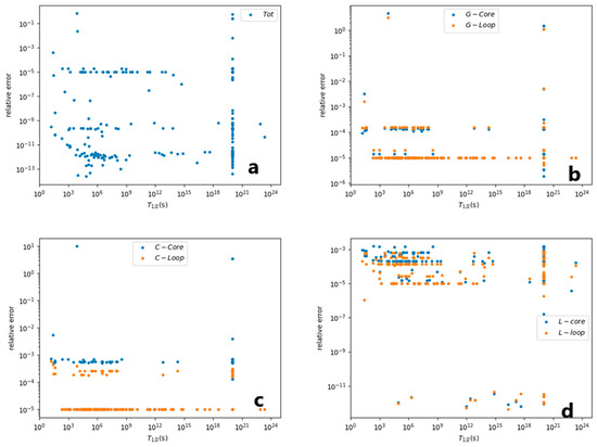 After encrypting the step size (five-step perturbation format, 4096 steps, corresponding to a time-step of 0.04 s for a single iteration step), the three-phase concentration error of each nuclide and the total amount of errors were obtained (in which the stabilized nuclide lifetime is set to 1.0 × 1020 s), and the performance of the solution was checked; the results are shown in Figure 9. As can be seen from Figure 9a, most of the total nuclide errors are below 10−5, and there are only a few nuclides with large errors, namely 106m1Rh (T1/2 = 7860 s), 114Cd (stable), and 112Cd (stable), which can be regarded as the problem’s strongly coupled nuclides.