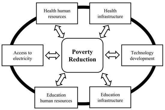 The socio-economic environment encompasses a wide range of elements that impact human well-being, including education, healthcare, and technology [11,12]. Considering that improvements in educational and health outcomes generally require investments in both infrastructure and human capital development [29], this study specifically deconstructs the socio-economic environment into five targeted factors, as shown in Figure 2, i.e., health human resources, health infrastructure, education human resources, education infrastructure, and technology development. Along with the factor of access to electricity, these six factors for poverty reduction are depicted around the periphery of Figure 2. The outer black circle indicates the potential interconnections between these factors, while the inner arrows signify their positive influence on poverty reduction.