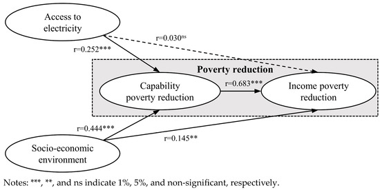 The relationships between access to electricity, the socio-economic environment, capability poverty reduction, and income poverty reduction, along with the results of the structural equation modeling, are summarized in Figure 3.