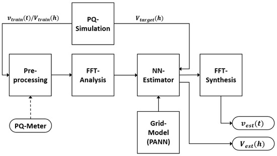 This concept enables the evaluation of the fundamental frequency and harmonic components of the voltage signals as complex vectors. However, the Fourier transform yields complex coefficients for every frequency, which may not only include harmonics but also sub-harmonics, inter-harmonics, and supra-harmonics. The initial version of this estimator is only trained for a fixed range of 20 harmonics, omitting the FFT capabilities shown in Figure 3. Therefore, the training dataset does not currently include any other data.