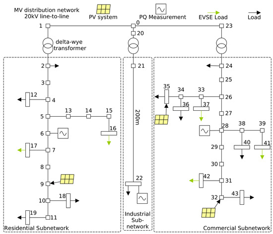 Figure 4 shows the simulated power grid, which was chosen to test the developed algorithms in depth due to its heterogeneous consumer structure (commercial, residential, industrial) and a typical rural distribution character of an LV/MV mixture [38]. The IEEE33-bus test system from [39] was also evaluated, but mainly for comparison with related work. Compared to the CIGRE LV grid, the second case study features only five non-linear loads, no generators, no transformers, and all nodes are at a medium voltage of kV.