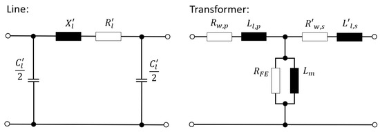 Circuit equivalents showing the considered components in the OpenDSS simulation. On the left, the typical -equivalent for lines is depicted. On the right, a transformer with leakage inductances /, winding resistors /, main reactance , and iron resistor is shown.