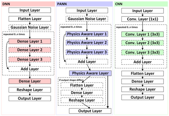 General overview of the compared architectures and layers used. The developed framework allows an individual number of layers. The DNN and the PANN models optionally use an additional noise layer on the input data. In this article, two dense layers, seven convolutional, and six physics-aware layers were used.