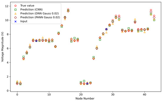 Ref. [26] used a method of pruning connections in a dense ANN (DNN) to integrate physical knowledge of the grid’s topology into the data model. This ANN architecture is known as physics-aware ANN (PANN) and will be applied in this work to incorporate information about infrastructure like connection dependencies of cables and transformers. According to [26], this method is especially suited for applications with a low coverage of measurements. The authors of this study demonstrate robust and precise estimation of fundamental frequency voltage phasors for distribution grids. The authors in [27] published the basis for the work in [26] and showed very short execution times for predictions with their PANN. Merely, ms were needed to estimate the PF for 37 nodes. Compared to DNNs, the PANN is resilient against overfitting and vanishing or exploding gradients. The SE accuracy in comparison to traditional iterative methods is better for almost every tested scenario. Especially when sparse meter coverage impedes convergence for conventional algorithms, the PANNs still provide very good SE results. Since the static structure of the distribution grid is integral to the ANN architecture, a trained model requires updating the structure and retraining if the evaluation object changes.