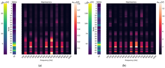 Specific Extensions: The reference grid from [38] is extended by three PV generators (node 9: kW, node 32: kW, node 35: kW), and five existing loads (nodes 16, 17, 37, 41, 42) are considered EVSE. Typical harmonic profiles realize harmonic current injection of these components. The other loads from [38] are considered linear and behave as constant power drains. All loads and generators are listed with their rated powers in Table A2 in the Appendix A.