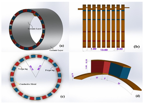 ATEG structural diagrams—(a) Overview of the annular thermoelectric generator (ATEG). (b) Side view of ATEG. (c) Single-ring structure of ATEG. (d) Dimensional diagram of thermoelectric elements [30].