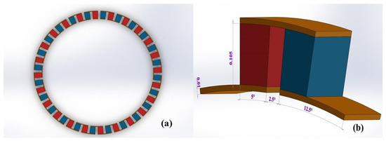 Annular thermoelectric generator with 24 thermocouple pairs—(a) Single-ring structure of ATEG. (b) Dimensional diagram of thermoelectric elements [30].