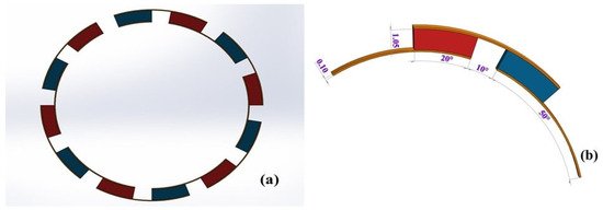 Annular thermoelectric generator with six thermocouple pairs—(a) Single-ring structure of ATEG. (b) Dimensional diagram of thermoelectric elements [30].