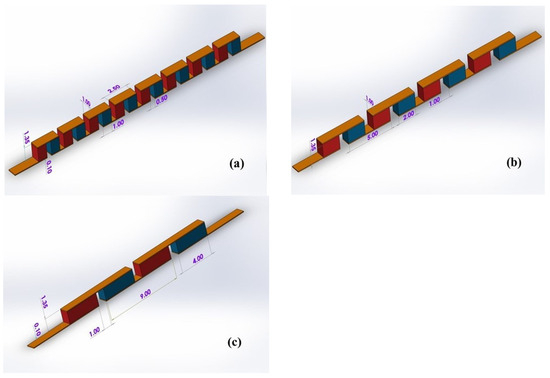Structure of the flat-plate thermoelectric module with a single row of thermocouples—(a) Thermoelectric element dimensions: 1 × 1 × 1.35 mm. (b) Thermoelectric element dimensions: 2 × 1 × 1.35 mm. (c) Thermoelectric element dimensions: 4 × 1 × 1.35 mm [30].
